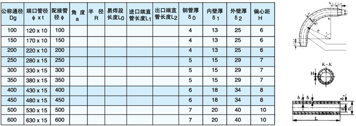 彎管尺寸及規(guī)格 ( 表中a、R、L0、L1、L2依設(shè)計要求確定 )